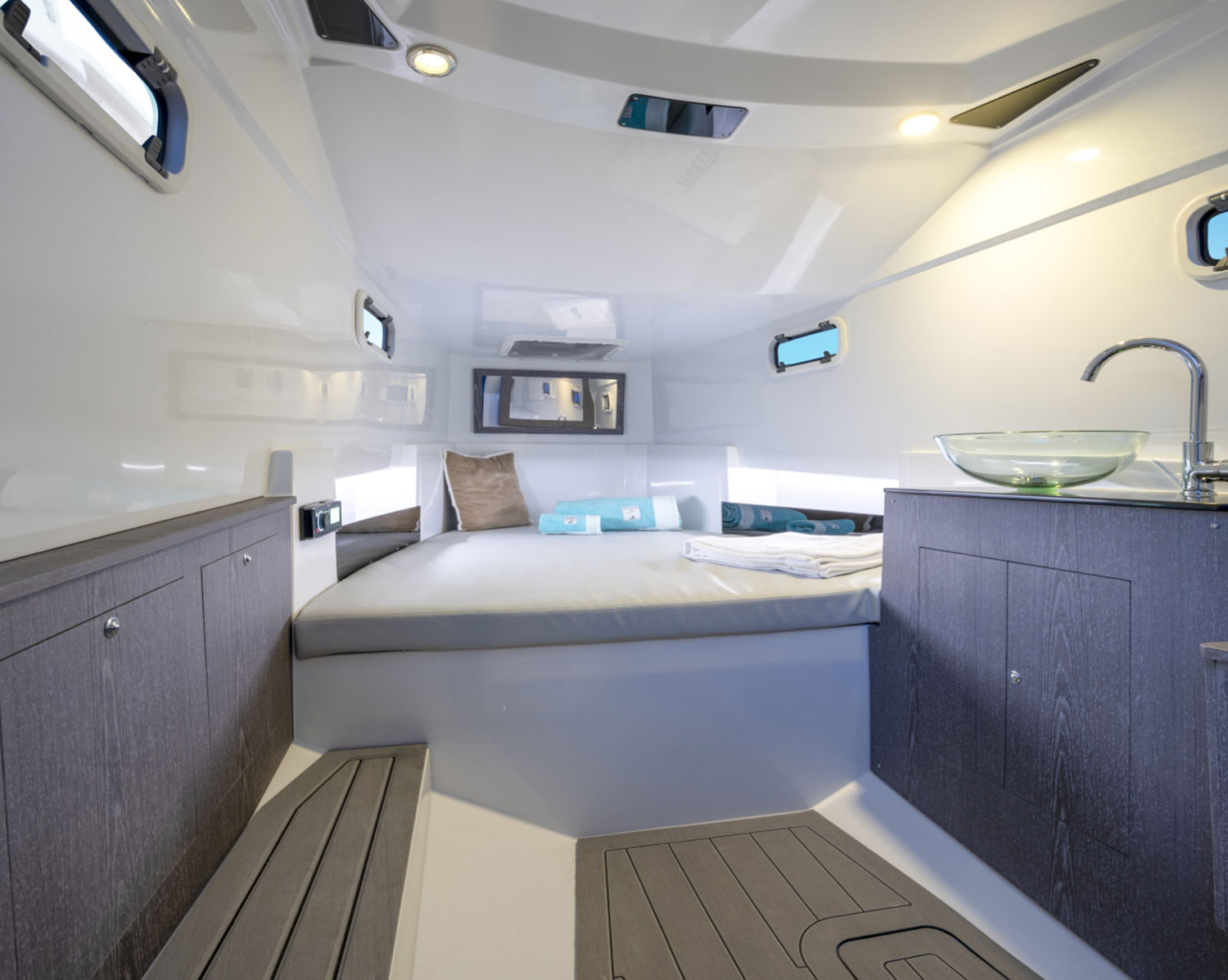 Le linee moderne e aggressive esprimono potenza e stabilità, mentre la progettazione degli spazi esterni è pensata per vivere il mare in totale relax. Le ampie zone prendisole a prua e a poppa permettono di godersi il sole durante la navigazione o durante le soste nelle baie più suggestive della costa ionica, mentre la spaziosa area pranzo consente di condividere aperitivi e momenti conviviali con vista sul mare siciliano.